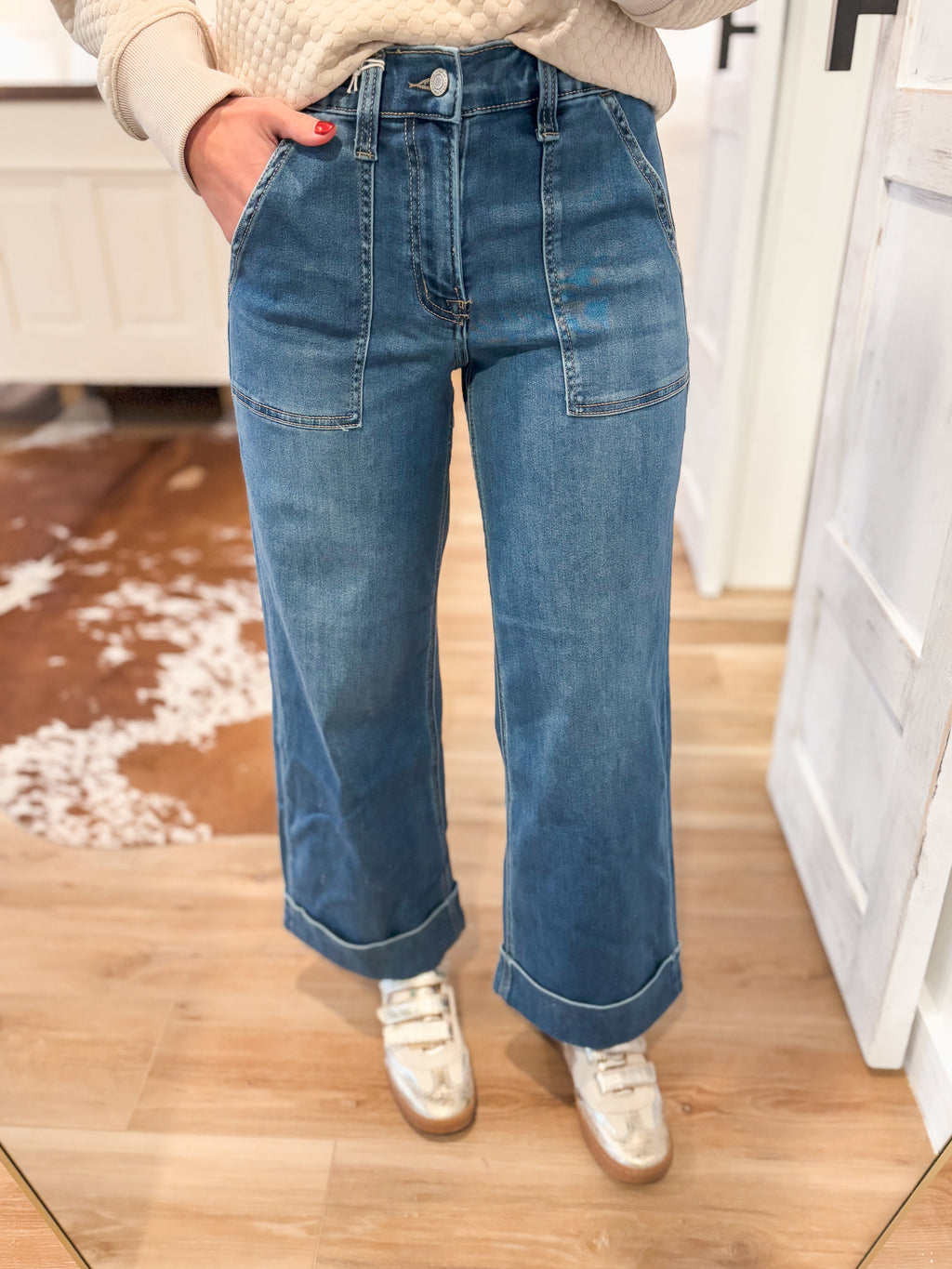 Superb High Rise Dark Wash Cropped Utility Straight Vervet Denim