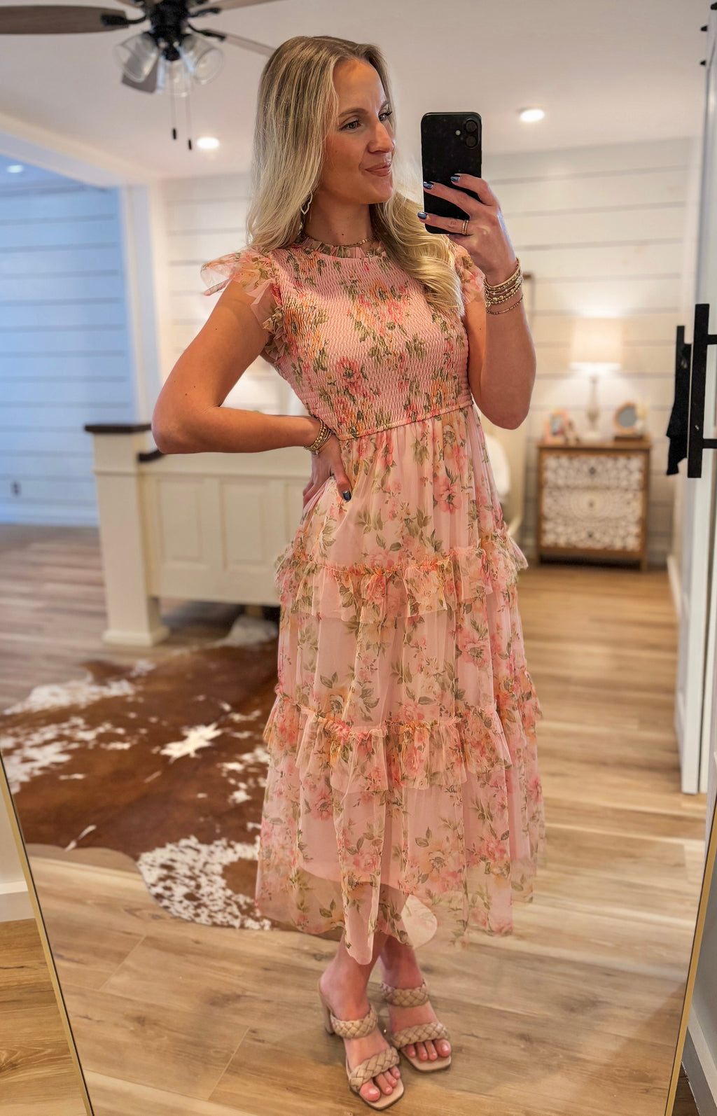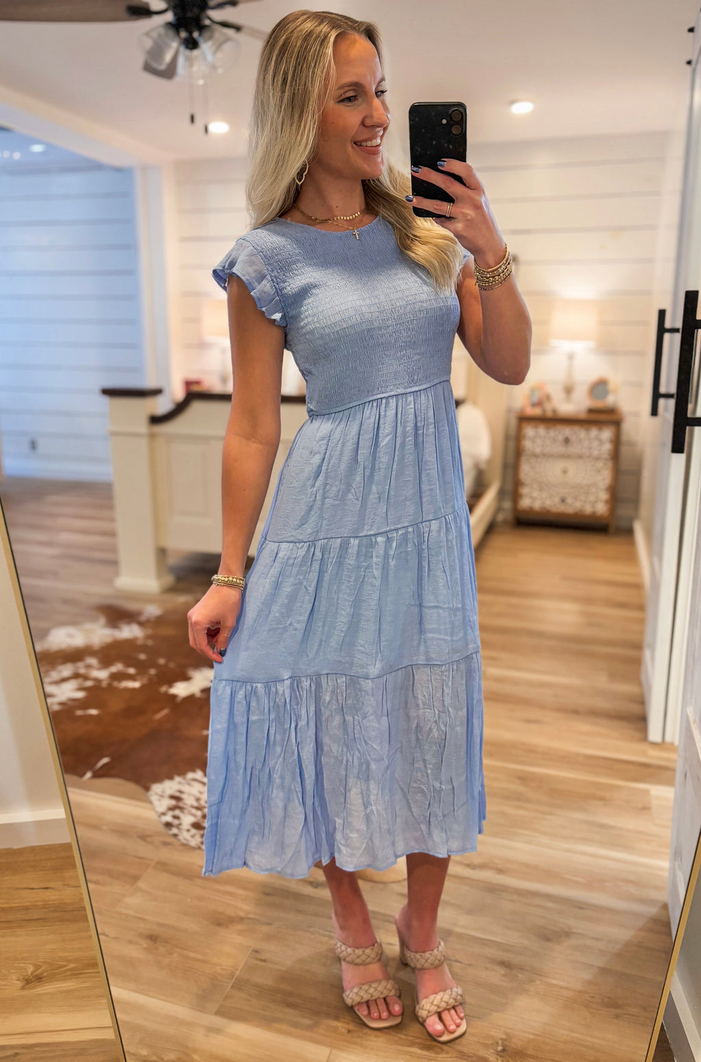 Garden View Baby Blue & White Blossom Printed Midi Dress