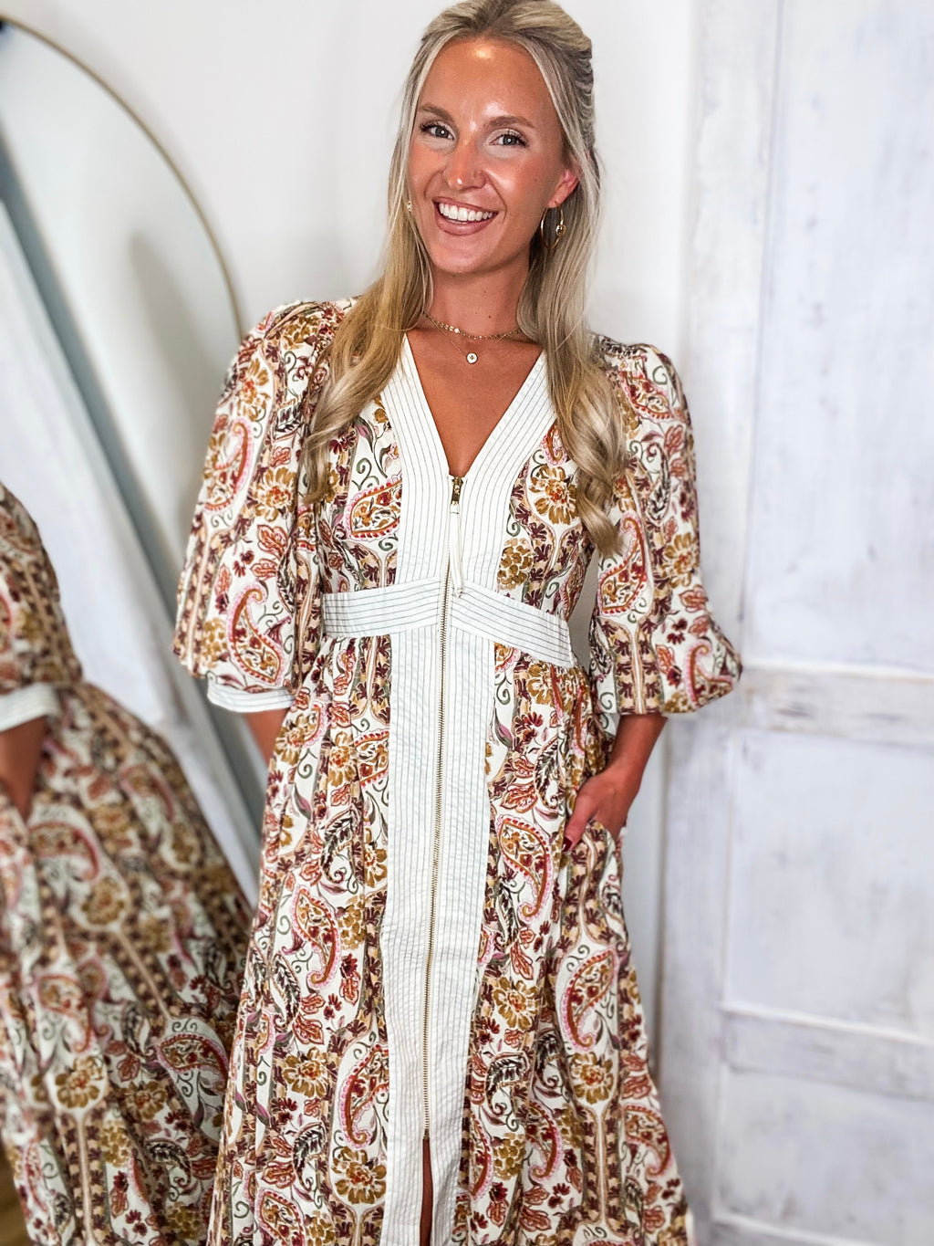 Way You Love Ivory Multi Paisley Zip Midi Dress