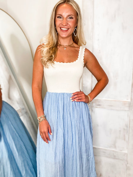 "Transition effortlessly in Above This Taupe & Blue Pin Stripe Midi Dress. With a charming square scalloped neckline and sweater vest bodice, this dress is both simple and stunning. The blue pin stripe flare skirt adds a cute touch, making it perfect for the beach. Get ready to turn heads!"