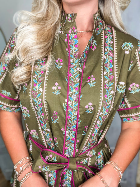 Step into fall with the All The Feelings Olive Floral Midi Dress! Featuring a playful pleated ruffle mock collar and a button-down front, this dress charms with rust contrast piping along the hem. The removable belt lets you switch up your style, while side pockets add handy flair. Wrapped in a lively multi-pink floral pattern, it’s the perfect pretty and classy choice to embrace the season with a dash of fun.