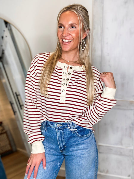 Stay stylishly on time with our Almost Late Henley! Featuring a playful round half snap neckline and chic burgundy & ivory stripes, this soft knit top effortlessly combines cute, casual, and comfy. Perfect for any day (even if you're running a little behind). Don't be fooled by the name, this top is right on time!"