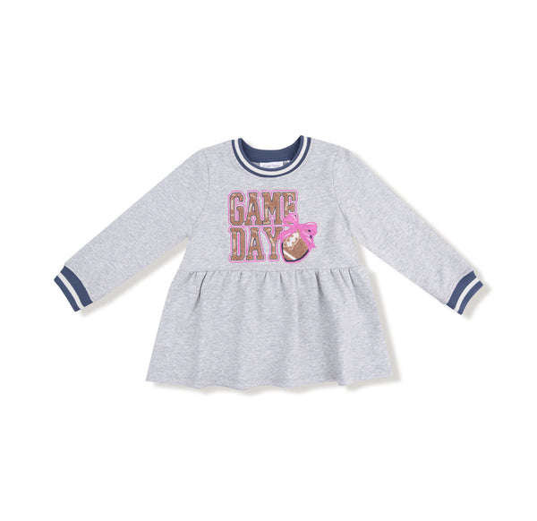 Score style points with our cozy Drop Waist Dress, made from soft French Terry and featuring a cute chenille “Game Day” football applique complete with a sweet bow. Perfect for little fans who want to cheer in comfort and charm, this dress offers a relaxed fit that’s great for layering and all-day play.