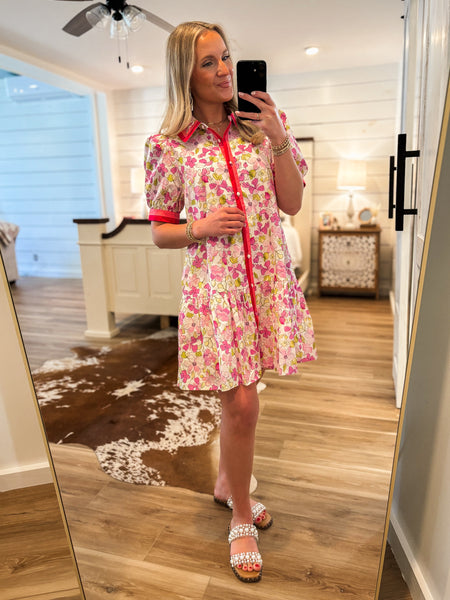 Get ready for compliments galore in the Blessing You Lavender Floral Mini Dress. With its bright and fun lavender floral print, this dress is perfect for any spring event or church. The collar neckline with pink contrast and puff sleeves add a cute and preppy touch. Plus, the button down front closure and front pockets make it both stylish and practical. Made with lined, woven fabric, you'll be comfortable and fashionable all day long.