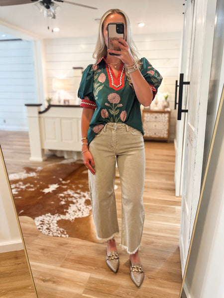 Step into fall with the Cinder High Rise Olive Barrel Vervet Denim! Featuring a super high rise waist and trendy barrel-style legs, these cropped jeans flaunt a playful frayed hemline that pairs perfectly with ankle boots or sneakers. The olive hue adds a fresh twist to your winter wardrobe, making these jeans your go-to for a stylish, comfy look all season long.
