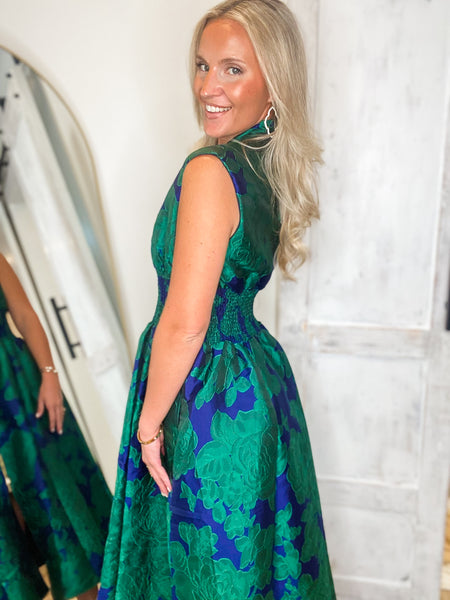 Classic Charm Royal Blue & Green Floral Front Zip Midi Dress