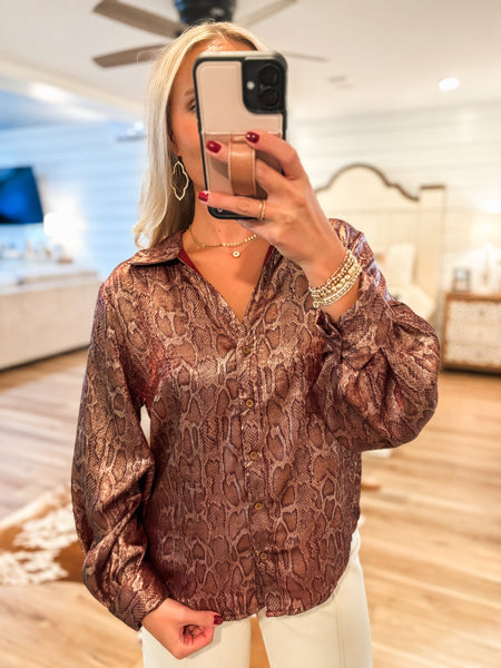 Elevate your wardrobe with this playful yet classy blouse featuring a chic collar neckline and a button-up front closure. The striking gold metallic snake print adds a fun edge, while the relaxed silhouette and balloon sleeves ensure comfort and style. Perfect for making a statement, this blouse blends cute details with effortless sophistication.