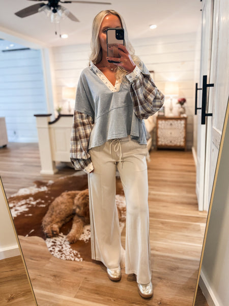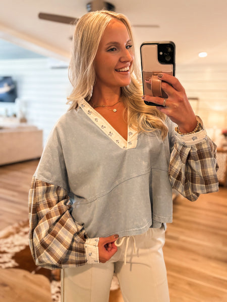 Embrace cozy charm with the Fall Into Me Denim Blue Mineral Washed Long Sleeve Top. Featuring a playful floral contrast V-neckline, slightly cropped length, and brown mix plaid sleeves, this relaxed fit bodice is mineral washed for ultimate softness. Perfect for casual days, it blends sweet style with comfy ease effortlessly.