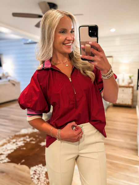 "Add some fun to your wardrobe with our From Here Burgundy Contras Blouse. Featuring a half zip contrast ribbed collar neckline and adorable puff sleeves with a contrast hem, this blouse is both cute and classy. The relaxed bodice gives you a preppy look that's perfect for any occasion!"