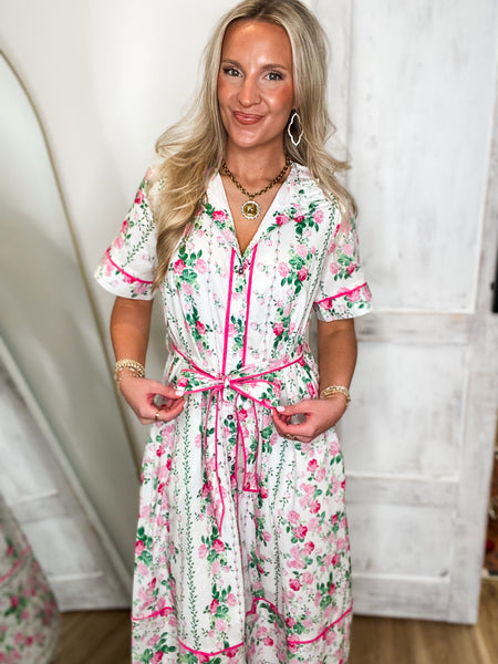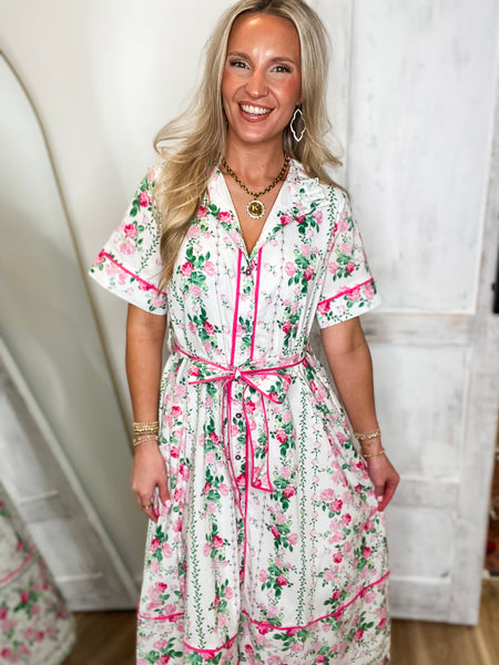 Gazing Over White/Pink Floral Midi Dress