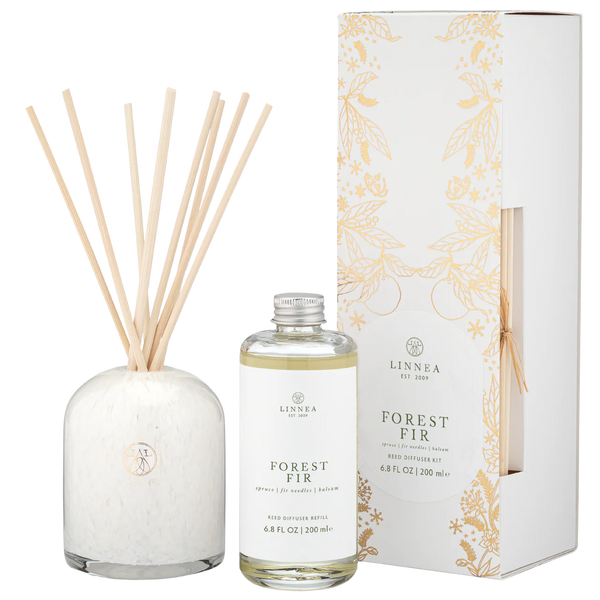 A refined homage to the noble Fraser fir, the Forest Fir Reed Diffuser Kit invites the season in—quietly and beautifully. Housed in handblown white glass, it diffuses notes of spruce, fir needle, and balsam with graceful ease. Keep near your tree to subtly extend its freshness, all season long.
