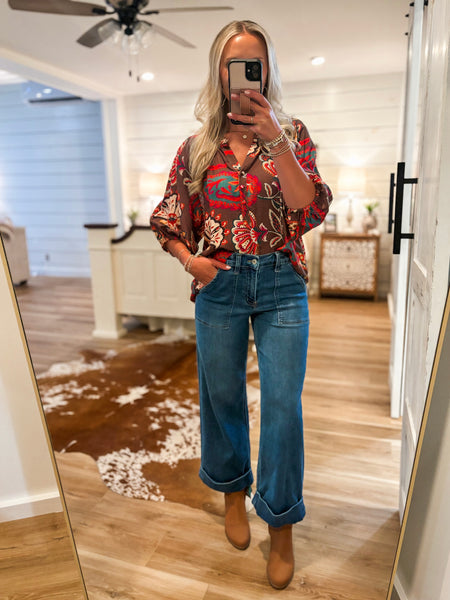 Step into cozy charm with the Making It Brown Paisley Blouse. Featuring a half-button V neckline and flirty 3/4 length balloon sleeves, this blouse offers a relaxed fit that feels as good as it looks. Its vibrant multi-color paisley print adds a playful pop to your fall and winter wardrobe, making it the perfect mix of cute and classy. Pair it with your favorite jeans or skirts for effortless seasonal style.