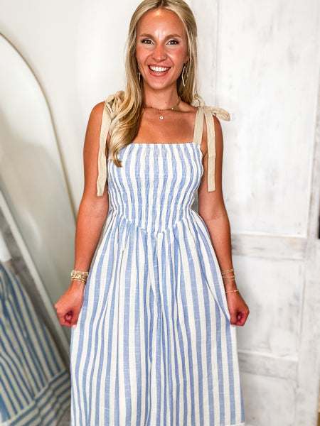 Embrace breezy beach vibes with this playful midi dress featuring a square neckline and charming contrast self-tie straps. The smocked drop waist flatters your figure while the flowy skirt moves effortlessly with every step. Crafted from a soft linen blend in a fresh blue and ivory stripe print, this lined dress combines comfort with a classy, stunning look perfect for sunny days and seaside strolls.