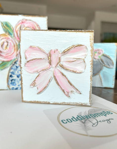 These adorable little 3x3-inch hand-painted and textured thick blocks make the sweetest happies for friends and loved ones. A collection of mini blocks makes a unique art installation for a small space.