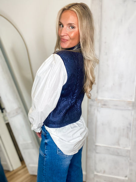 Planned Event Navy Foil Cable Knit Sweater Blouse