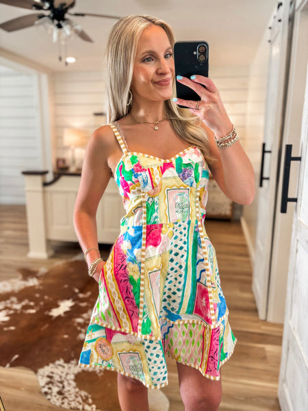 Get ready to hit the resort in style with our Resort Ready Pastel Tropical Mini Dress! Featuring a sweetheart neckline with stripe contrast detail, zip back closure, and spaghetti straps, this dress is perfect for your summer vacation. The flare skirt and pastel tropical print add a fun and colorful touch, making it oh so cute and playful. Say hello to your new go-to dress for a tropical getaway!