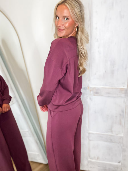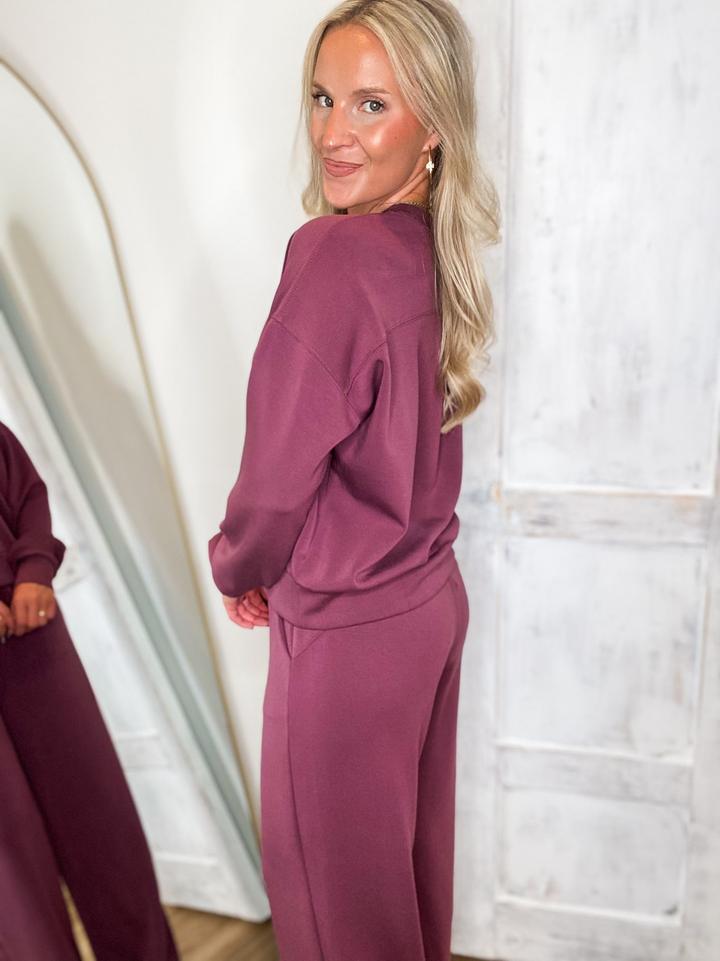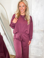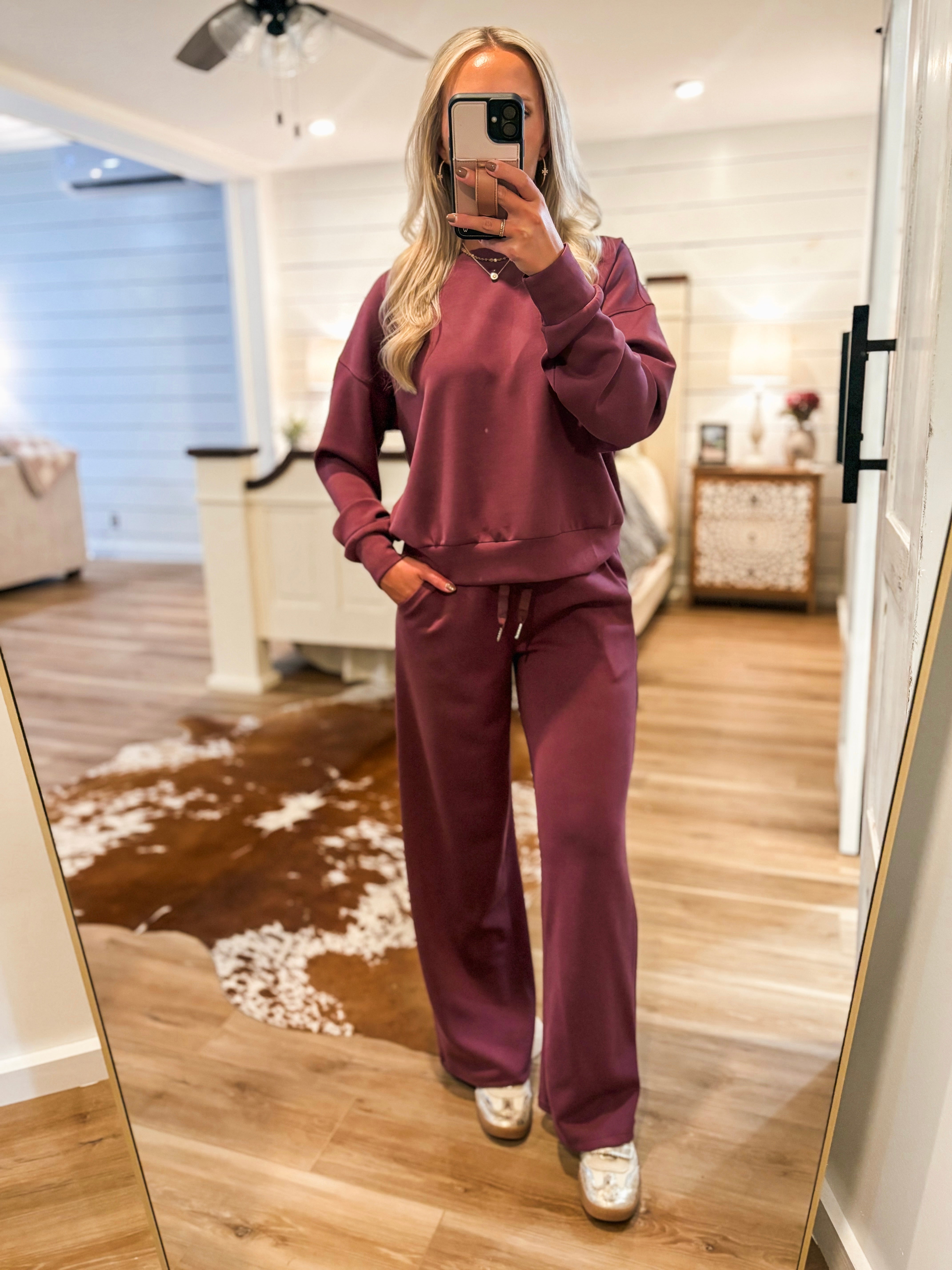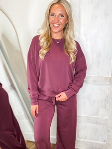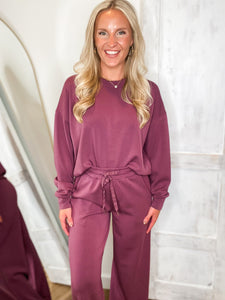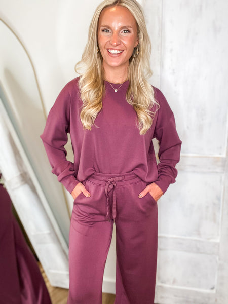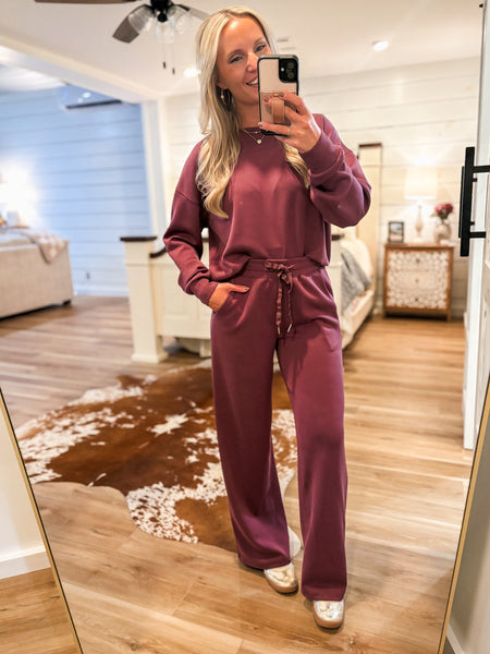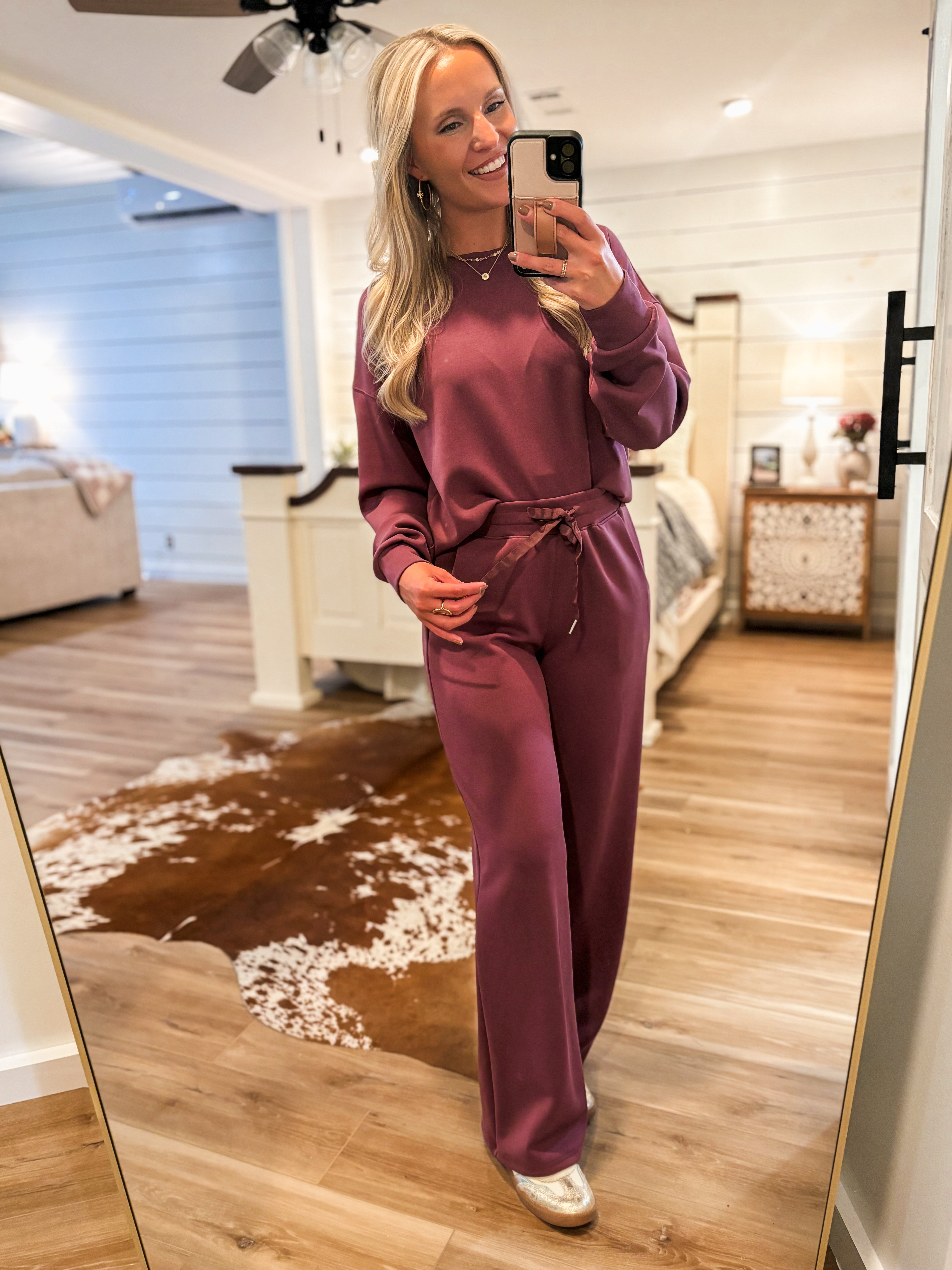 Cozy up in the Set A Time Luxe Plum Sweatshirt & Lounge Pant Set, designed for ultimate comfort and style. The sweatshirt’s round neckline and relaxed fit offer an effortless vibe, while the lounge pants feature a wide leg and adjustable drawstring waist for a perfect, laid-back fit. Made from luxuriously soft butter fabric, this set is both cute and casual—ideal for chilling at home or stepping out with ease.