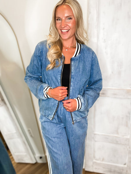 Zip up, head out in style with our Step Forward Denim Zip Track Jacket. Made with lightweight washed denim fabric for a relaxed silhouette, it features a front zip closure, round contrast neckline, and contrast cuffs. Don't forget to complete the look with the matching pants!