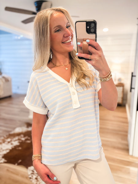 Get ready to rock your casual style with the Still Here Powder Blue Stripe Henley Blouse! This adorable top features a v neckline with half button detail and contrast sleeves, all in a blue and taupe stripe pattern. The ribbed fabric and stretchy bodice provide ultimate comfort, making it perfect for those simple, laid-back days. Don't miss out on this cute and comfy addition to your wardrobe!