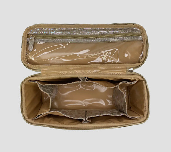 Adam Glassman added the Stylist Travel Bag to his Style Sheet! 'Keep hair tools and makeup separate with the two compartments.' The Glimmer Leopard Stylist Bag is designed for hot styling tools and keeping them separate from your other beauty products. The top compartment features a heat resistant liner so you don't have to wait to put away your hot tools. The bottom compartment is ideal for larger and heavier items such as bottles, jars, hairbrushes and more. The two combine to make the ultimate toiletry case. Features: * TOP - Heat Resistant for Hot Styling Tools * TOP - Side Pocket to Protect Cords * BOTTOM - Top Interior Clear View Zippered Pocket * BOTTOM - Large interior Center Compartment * BOTTOM - Six Interior Side Pockets Size Information: * 14" L x 4" W x 10” H Material: