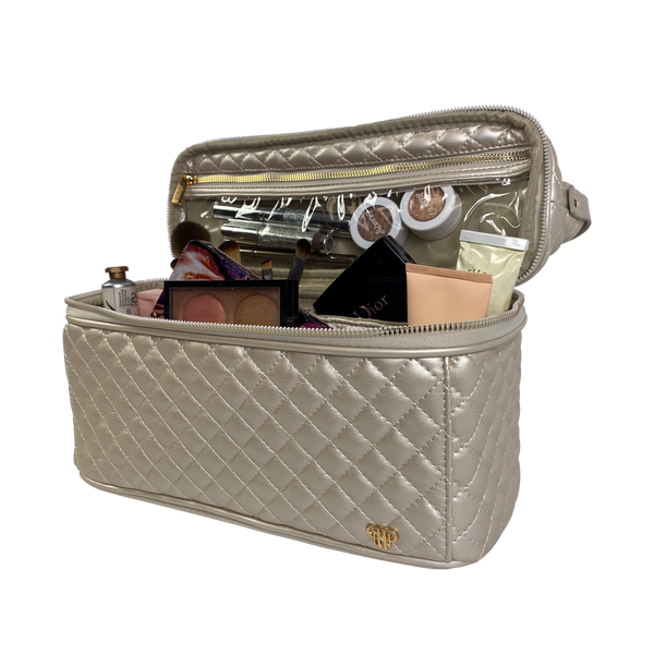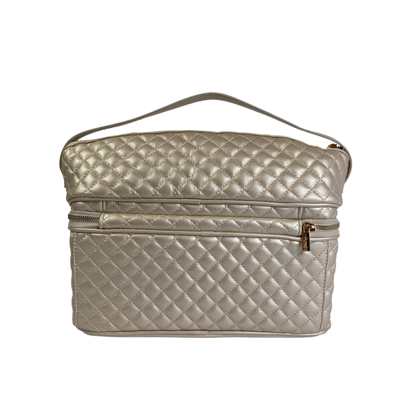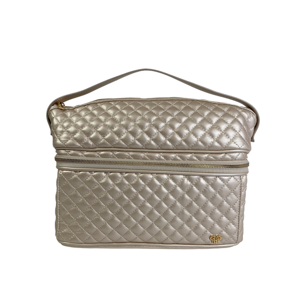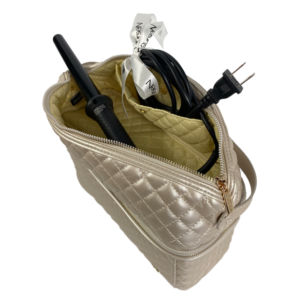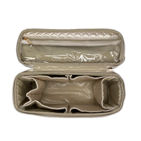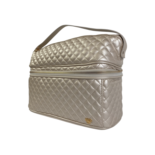 Our Pearl Quilted Collection is definitely a bridal favorite (think bride's maid gifts)! The Pearl Quilted Stylist Bag is designed for hot styling tools and keeping them separate from your other beauty products. The top compartment features a heat resistant liner so you don’t have to wait to put away your hot tools. The bottom compartment is ideal for larger and heavier items such as bottles, jars, hairbrushes and more. The two combine to make the ultimate toiletry case.