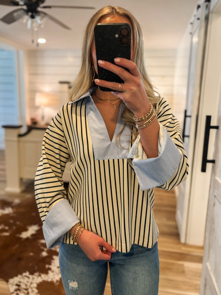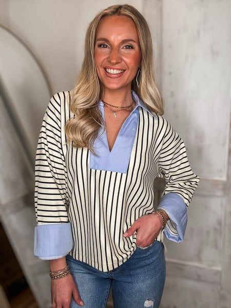 Up your office style game with the Telling You Stripe Contrast Blouse. Featuring a collar neckline, cream and black stripe pattern throughout the bodice, and a chic blue contrast hem on the neckline and cuffs, this blouse is perfect for a relaxed yet preppy look. With its stunning and timeless style, you'll be turning heads and telling everyone about this blouse.