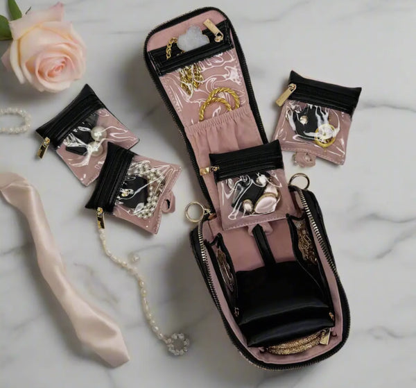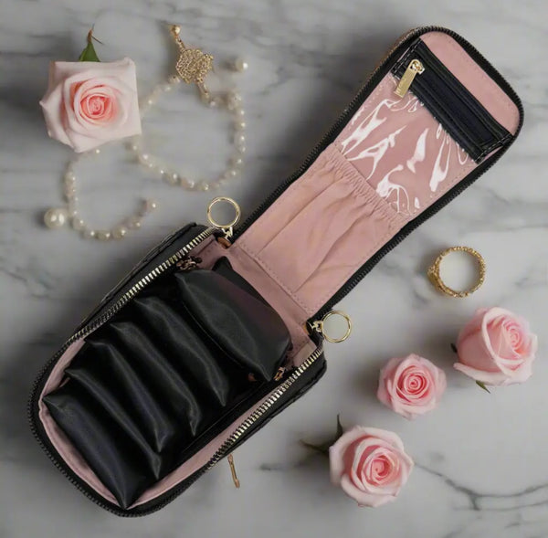 Chic, compact, and cleverly designed, the Train Jewelry Case in classic black Timeless Quilted is your go-to for maximum organization in a perfectly portable size. Ideal for small to medium jewelry pieces, it unzips to completely reveal a thoughtfully arranged interior featuring 2 elastic pockets, 3 clear front zippered compartments, and space for everything from studs to statement pieces. With 3 earring stays, 3 necklace holders, and 6 removable clear front pouches included, this soft-sided case brings effortless elegance to your travel routine - and keeps your sparkle sorted and easy to see wherever you go. Features: * Compact Design * Zip-Front Design For An Organized Effortless Experience * 6 Removable Clear Front Pouches * 2 Interior Elastic Pockets * 3 Interior Clear Pockets Includes: * 3 Earring Stays * 3 Necklace Holders Size Information: * 4" L x 3.5" W x 6” H Material: * Black - Vegan Leather Exterior * Pale Pink - Microsuede Interior * Clear - PVC Plastic