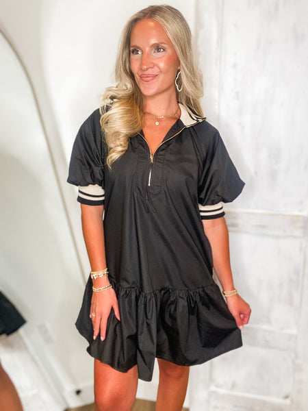 "Upgrade your wardrobe with the What's Next Black Contrast Mini Dress, featuring a playful half gold zip collar neckline with ribbed cream contrast. Its ruffle skirt and puff sleeves add a touch of sass to the cute and classy design. Stay preppy and stylish with this relaxed bodice dress, complete with front pockets."